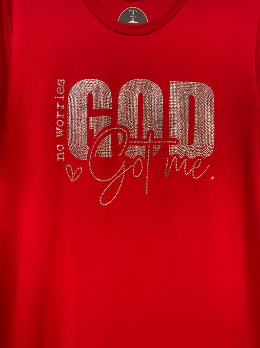 "NO WORRIES GOD GOT ME" SPARKLING RHINESTONE RED TEE ** Free Shipping **