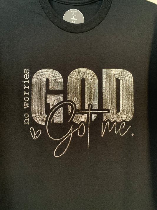 "NO WORRIES GOD GOT ME" SPARKLING RHINESTONE BLACK TEE ** Free Shipping **