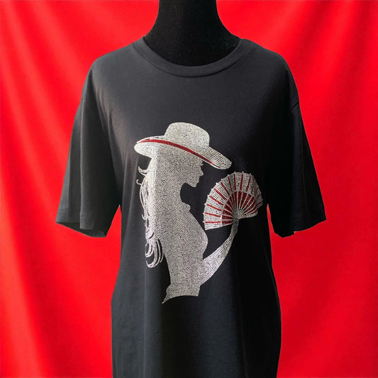 RADIANT RED AND CRYSTAL RHINESTONE COWGIRL WITH FAN - BLACK TEE ** Free Shipping **