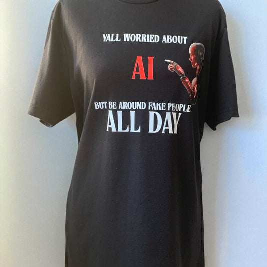 "YALL WORRIED ABOUT AI BUT BE AROUND FAKE PEOPLE ALL DAY" - BLACK TEE/RED AI - UNISEX **Free Shipping **
