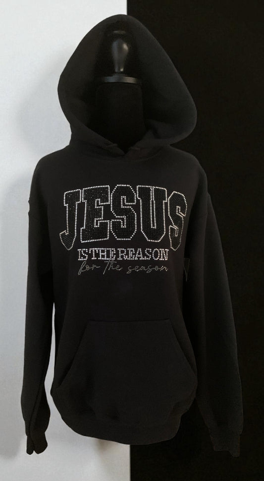 "JESUS IS THE REASON FOR THE SEASON" BLACK HOODIES AVAILABLE IN BLACK/SILVER AND RED/GREEN RHINESTONES **Free Shipping**