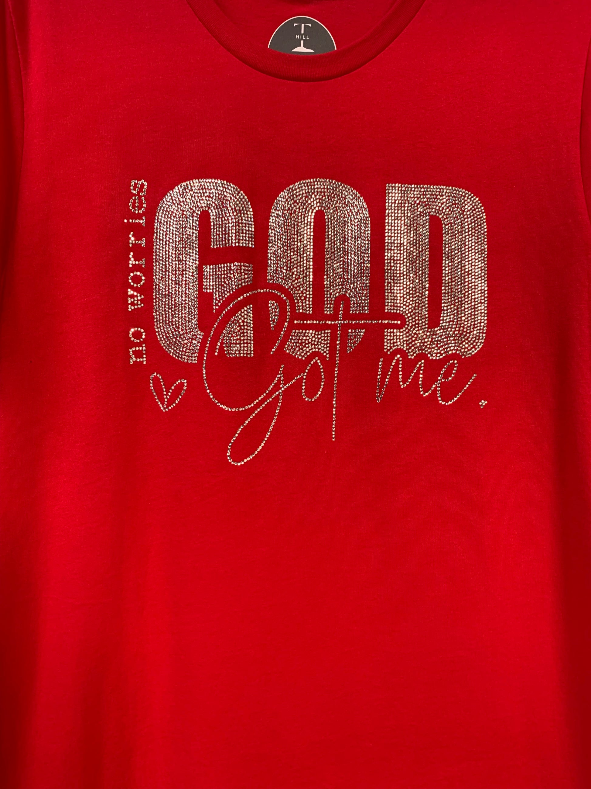 NO WORRIES GOD GOT ME SPARKLING RHINESTONE RED TEE ** Free Shipping **