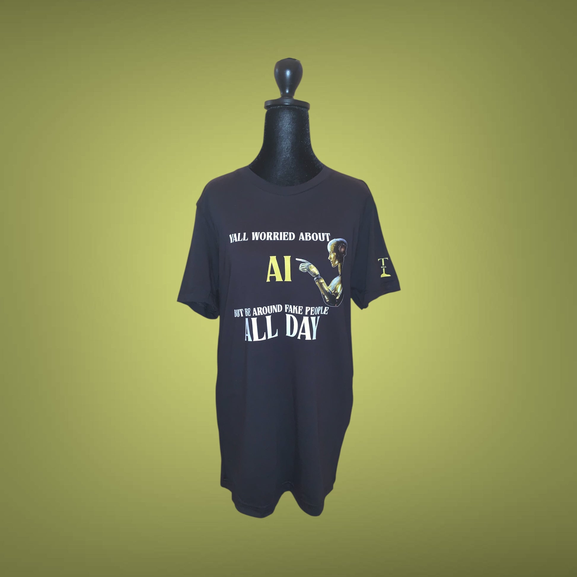 "YALL WORRIED ABOUT AI BUT BE AROUND FAKE PEOPLE ALL DAY" - BLACK TEE WITH OTHER COLOR OPTIONS FOR AI ROBOT - UNISEX **Free Shipping **💛 💚💙🩷
