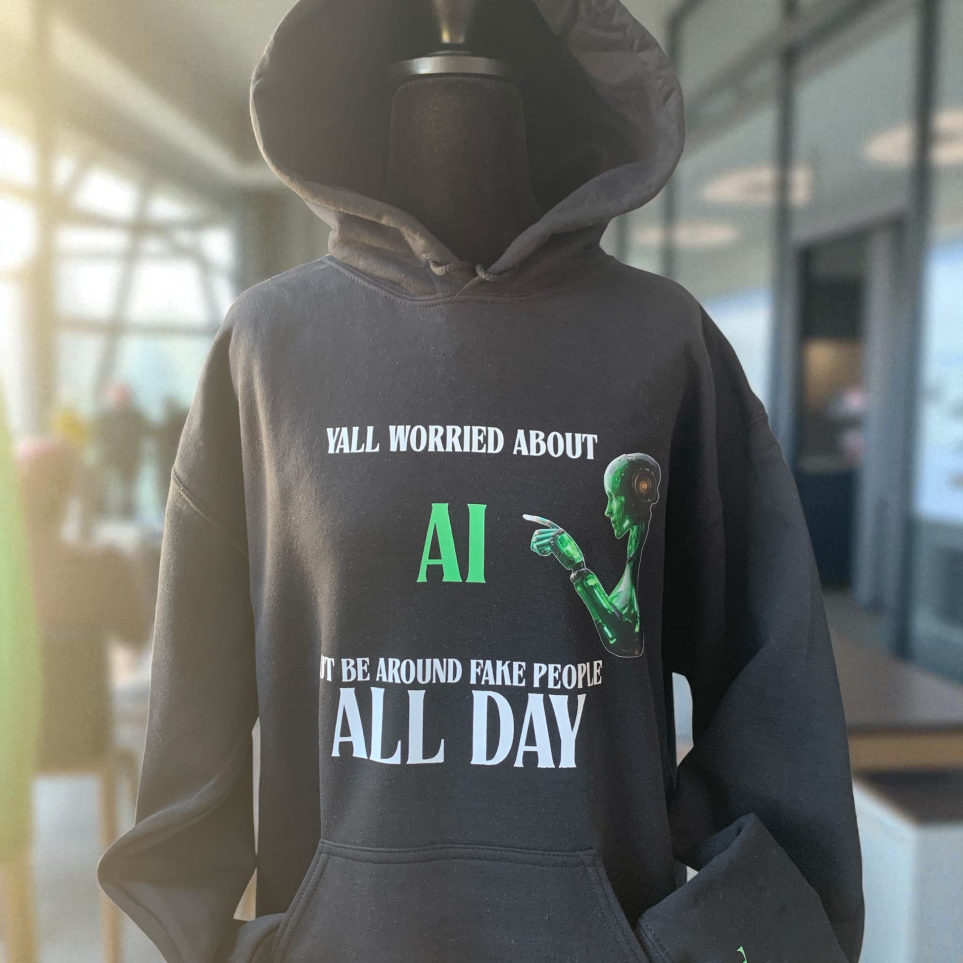 YALL WORRIED ABOUT AI BUT BE AROUND FAKE PEOPLE ALL DAY - BLACK HOODIE/GREEN AI **Free Shipping **